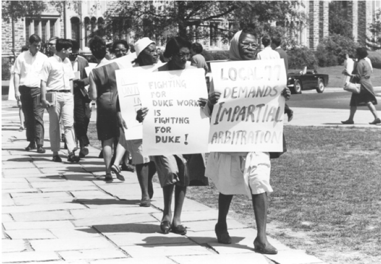 Employees, students, and faculty in solidarity for the dignity of work at Duke. In front of the Duke Administration Building, April 19, 1967. Courtesy of Durham Civil Rights Heritage Project, Duke University Labor Organizing, 1961-1968, Durham County Library. Photograph by Bill Boyarsky.