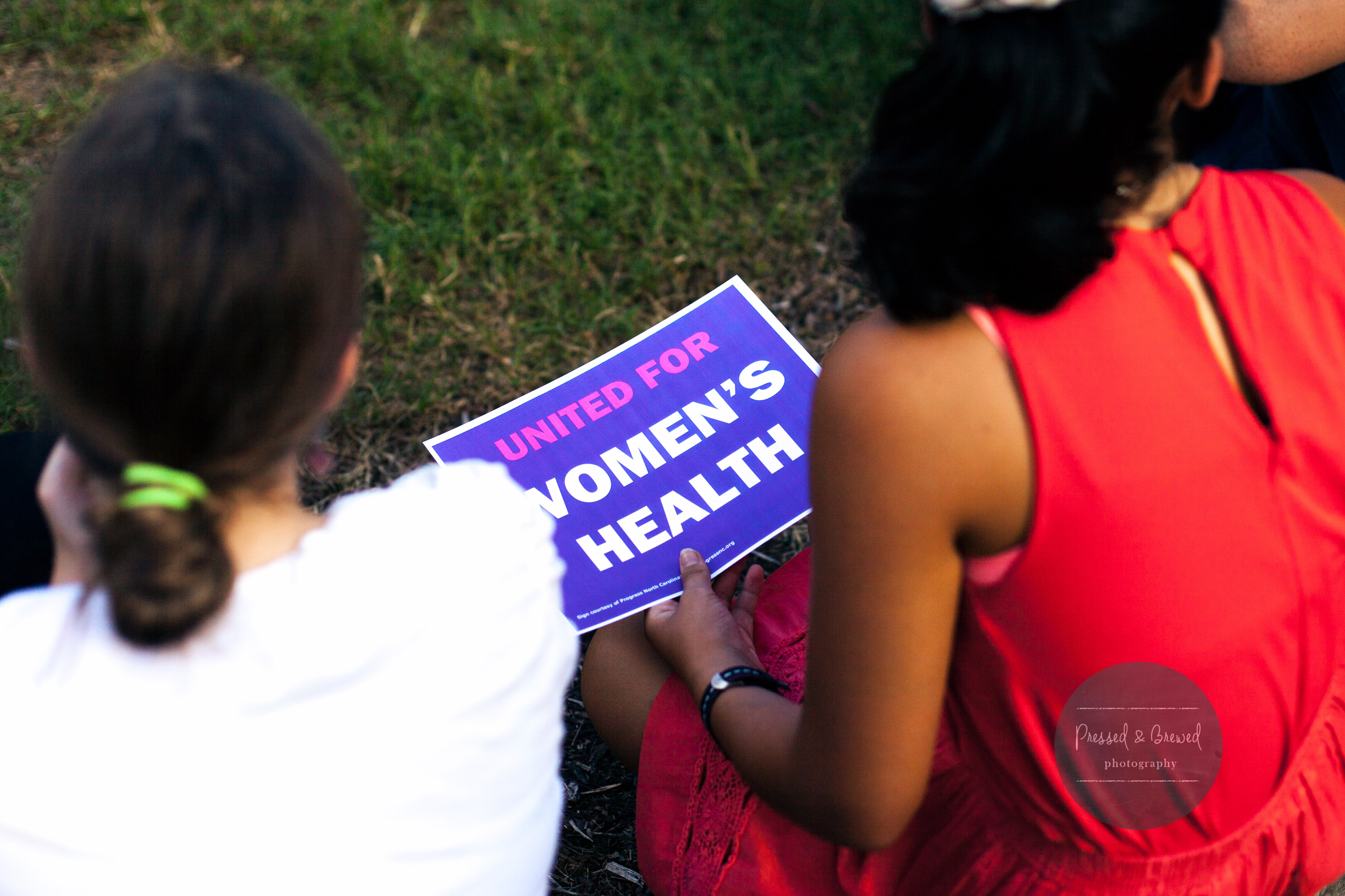 Someone handed Emily and her friend this sign to hold at the gathering. They both just learned health in their fifth grade class at George Watts Elementary. At this particular rally, they were privy to hundreds of women – teens and grannies in cut-offs and in swishy skirts – standing up for real funding for women’s health. As we walked around with our fabulous new banner, many women cheered for the pro-teacher message on the backside, a timeless note about the wisdom of investing in public schools, because, after all “No one can make a dollar stretch like a school teacher!” This was particularly appropriate given that an actual school teacher made the banner with quilting scraps and fabric glue!