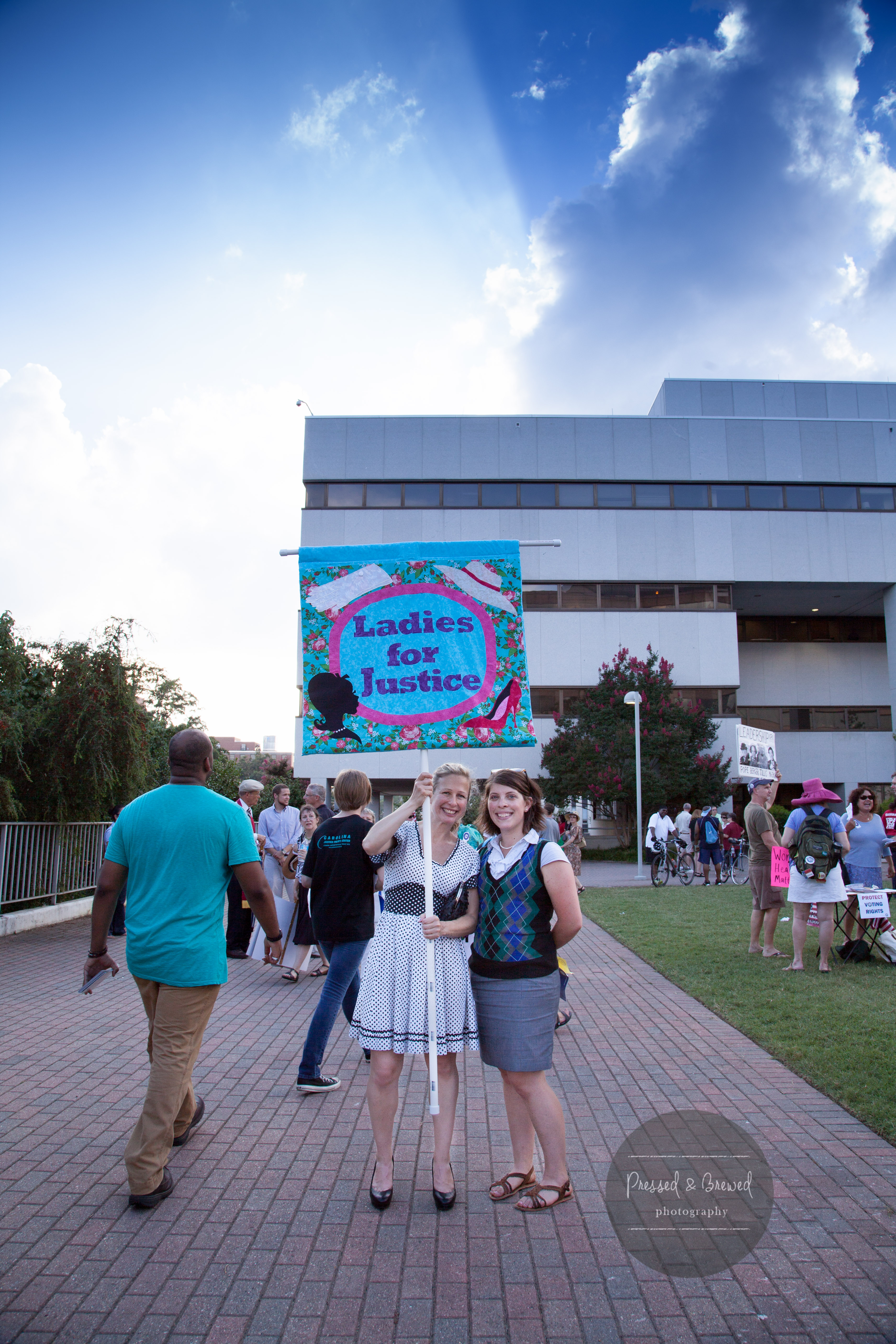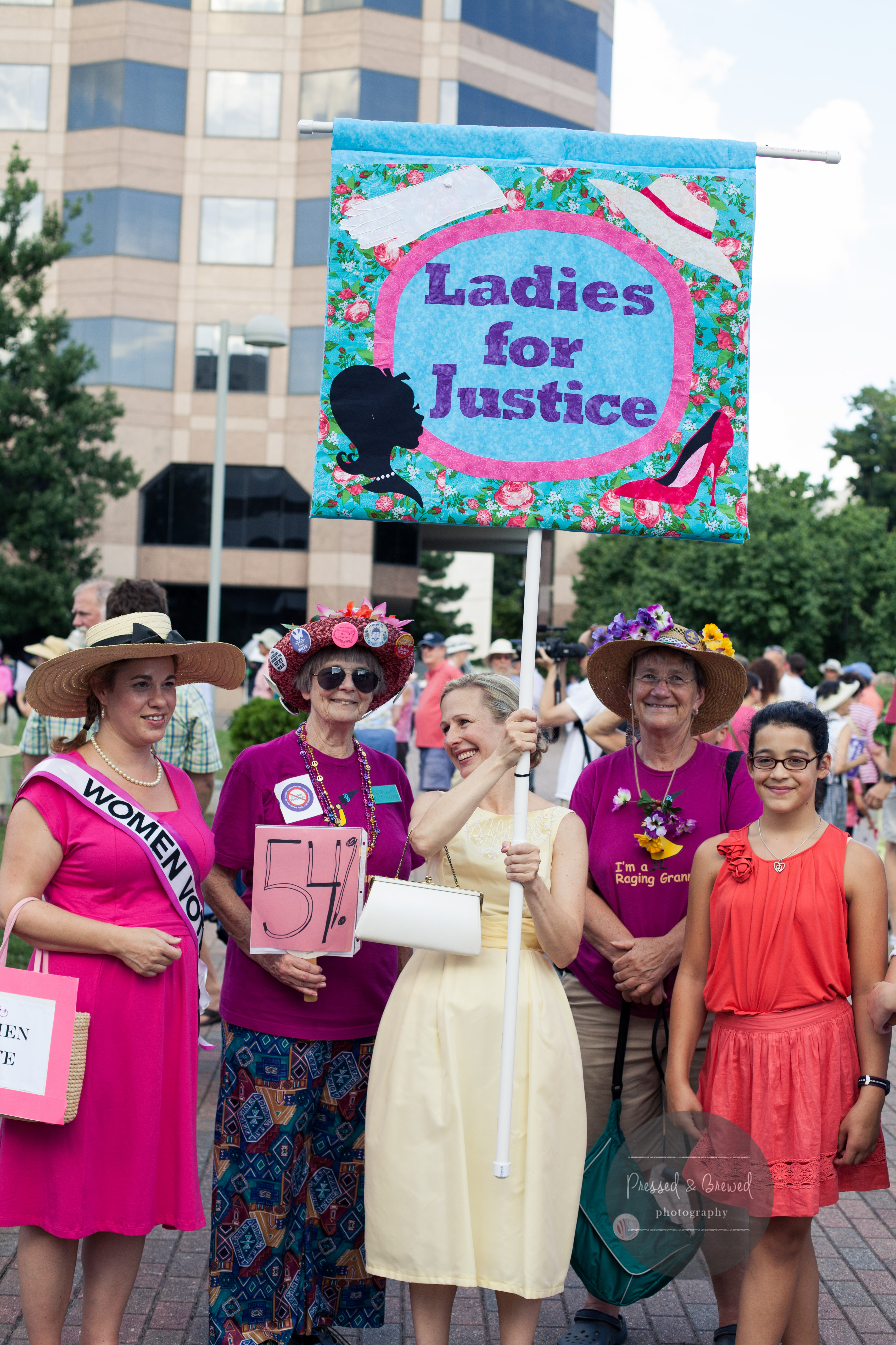 At one of the Moral Monday gatherings, I came across a sweet young man carrying the most adorable banner with a trenchant word about the big lies behind austerity politics. (I “tweeted” a picture of the banner that day. You can see it here.) It was just my sort of combination of smart, ticked-off, and sweet. I eventually met his mother, a public school teacher in the area, and asked if I could share a photo of the banner. She not only said yes, she offered to make me one! She insisted I come up with the theme and that we collaborate on details. Around that time, various talking-heads were suggesting that the protests were undignified, so I decided to inhabit and do the twist with that idea, and be a well-dressed, ticked-off, righteous-seeking Lady for Justice. I am not quite old enough yet to be a Raging Granny, but, the next week, a few of them stood with us for a photo, along with a brave suffragette, who was delighted to find someone else in costume.